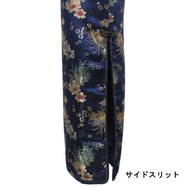 【即納】定番チャイナドレス 半袖 ロング丈(ネイビー)