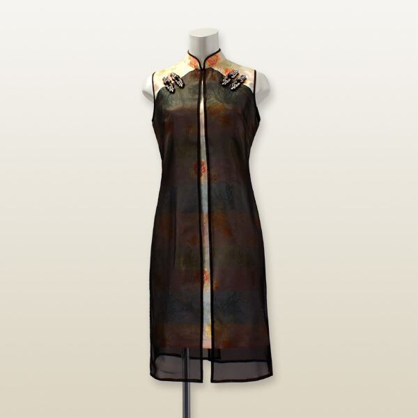 華やかなチャイナ生地にシフォン生地を重ねた、印象的なチャイナドレスです。中央と両サイドが大きく開いたシフォン生地が、ひらひらとカッコ良くなびくデザイン!透け感ある黒のシフォン生地がチャイナ服と見事なコンビネーションです。 演奏用の衣装や、イベント・パーティー用として目を惹く一品です。