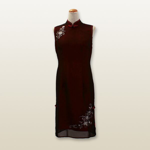 【即納】花刺繍2枚重ねチャイナドレス ノースリーブ ひざ丈(レッド×ブラック)