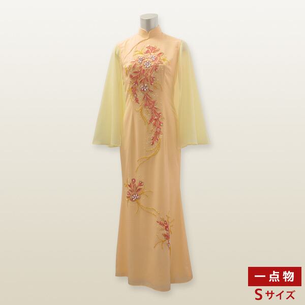華やかな装飾とマーメイドラインが魅力の、Sサイズの一点ものチャイナドレスです。ノースリーブのドレスに透け感のあるシフォン生地を縫い付けたデザインは、まるで羽衣をまとったような優雅な1着! 腕をさりげなくカバーしながら上品な女性を演出してくれる、他では手に入らない美しいチャイナドレスです。