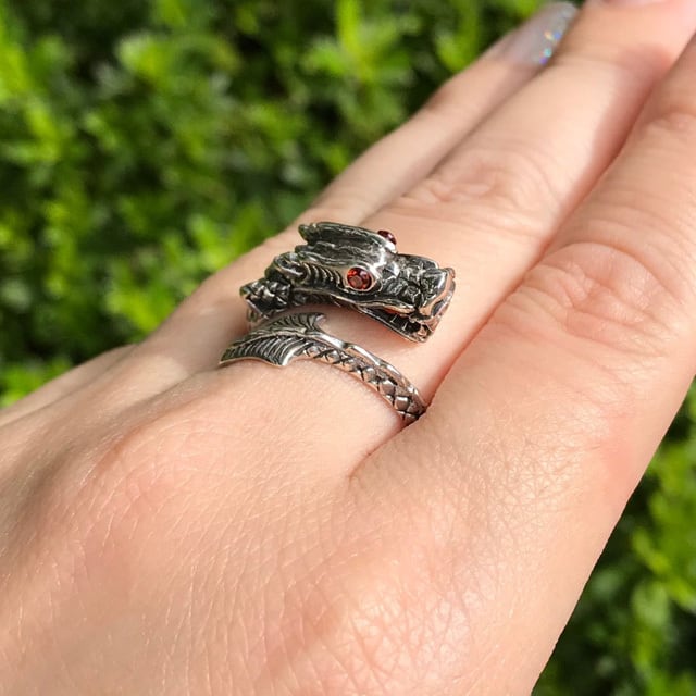 オリジナルのドラゴン(龍)でカッコいいシルバーリングを作りました!ドラゴンがぐるりと指に巻きつくデザインがクールで個性的!女性が付けてもバランスが良いようゴツゴツしすぎないように製作しました。もちろん男性がつけてもOK!!ドラゴン好きには見逃せないシルバーアクセです。
