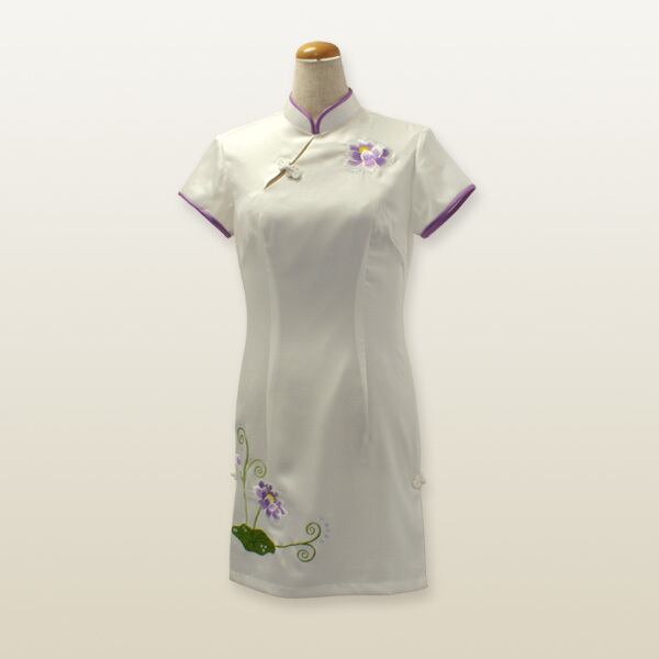 【即納】ロータス蓮チャイナドレス 半袖 ミニ丈(パールホワイト)