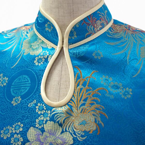 首元が涙型に開いたデザインが、女性らしいキュートな雰囲気のチャイナドレスです。印象的なパイピング使いが目を惹くドレスは、明るく華やかな生地・柄の存在感もバツグン!結婚式や二次会などのパーティードレスとして人気が高く、イベントや演奏会などの衣装としてもおすすめの1着です。