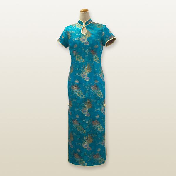 【即納】ティアドロップ定番チャイナドレス 半袖 ロング丈(アトランティコブルー)